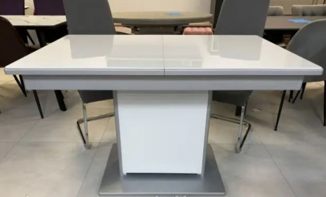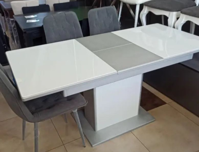 Цвет стола: серый, столешница - мдф +стекло Белое, вкладка -мдф +шпон.
